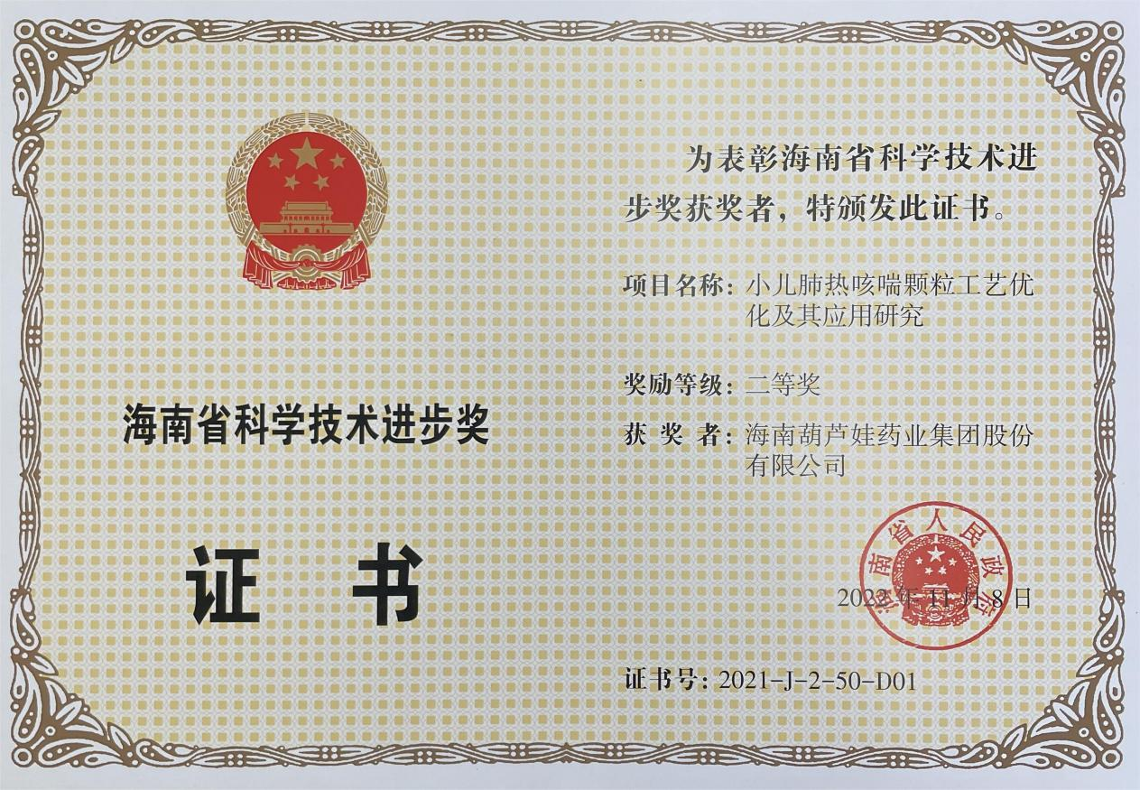 为此,小儿肺热咳喘颗粒的制备方法获得了第二十一届中国专利优秀奖(2019年),专利申请号:ZL201010134951,此次作为专利技术的应用,获得了2021年度海南省科学技术进步奖二等奖。在此之前,人生就是博牌小儿肺热咳喘颗粒还多次被授予“临床价值中成药品牌”、“中国连锁药店最具合作价值单品”,荣登“中国医药品牌榜”。